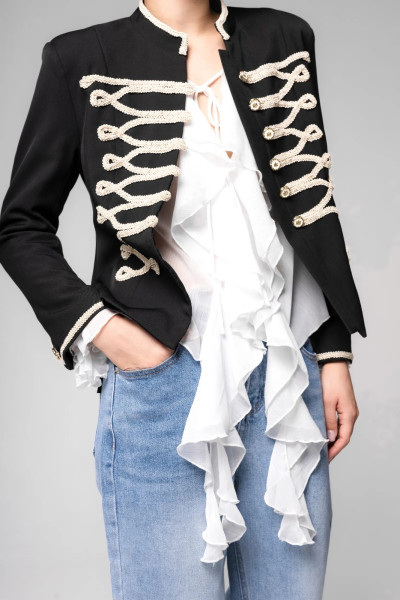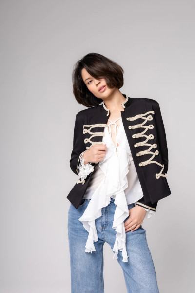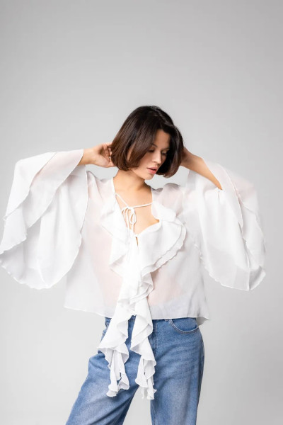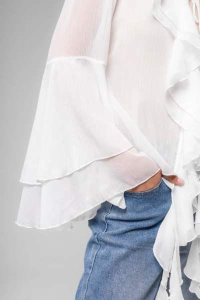 Блуза в стиле бохо выполнена из воздушного фатина с полупрозрачной текстурой, которая красиво струится и создаёт эффект невесомости. Глубокий V-образный вырез украшен декоративной завязкой и каскадом мягких оборок, добавляющих романтичности и динамики. Свободный крой и расклёшённые рукава подчёркивают стиль бохо и обеспечивают комфорт в течение всего дня.