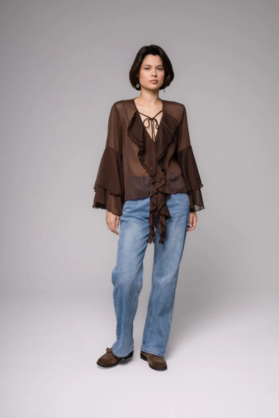 Блуза в стиле бохо выполнена из воздушного фатина с полупрозрачной текстурой, которая красиво струится и создаёт эффект невесомости. Глубокий V-образный вырез украшен декоративной завязкой и каскадом мягких оборок, добавляющих романтичности и динамики. Свободный крой и расклёшённые рукава подчёркивают стиль бохо и обеспечивают комфорт в течение всего дня.