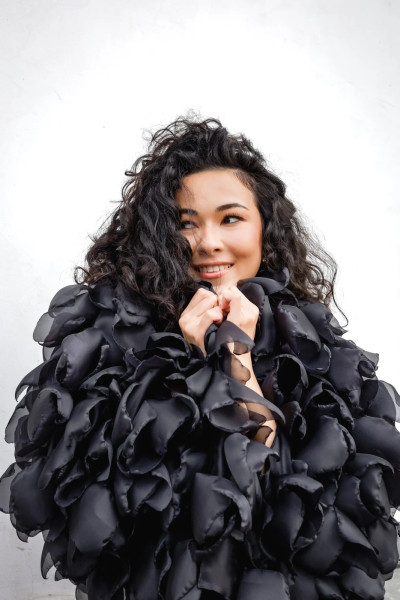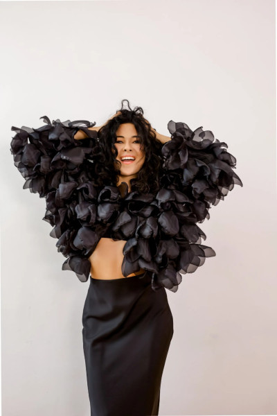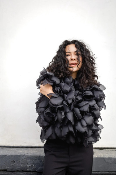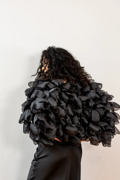 Бомбер выполнен из лёгкой органзы и украшен крупными объёмными лепестками по всей поверхности. Модель имеет свободный силуэт и застёгивается на одну пуговицу, что подчёркивает воздушность и лёгкость конструкции. Изделие полностью выполнено вручную.