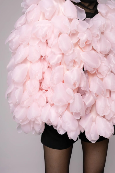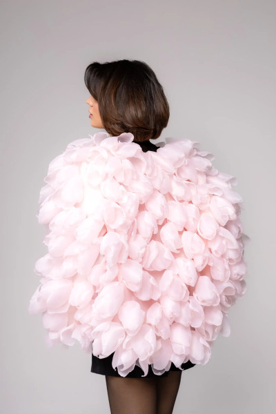 Бомбер выполнен из лёгкой органзы и украшен крупными объёмными лепестками по всей поверхности. Модель имеет свободный силуэт и застёгивается на одну пуговицу, что подчёркивает воздушность и лёгкость конструкции. Изделие полностью выполнено вручную.