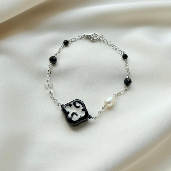 Браслет «Айша-Биби» — утончённое украшение, вдохновлённое легендой о вечной любви и верности. Он создан из натуральных камней — агата, жемчуга и хрусталя, гармонично сочетающих глубину, чистоту и свет.