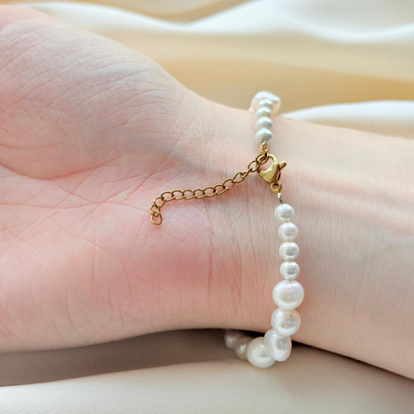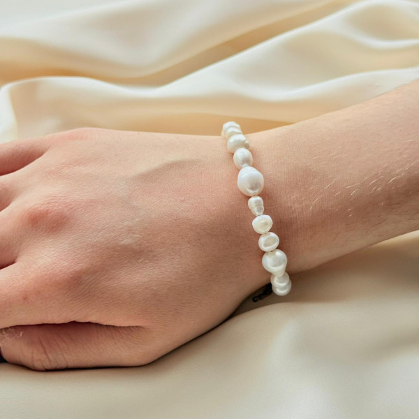 Изысканный браслет из натурального жемчуга, выполненный в классическом стиле. Бусины различной формы придают украшению живую текстуру и лёгкую асимметрию — каждая жемчужина уникальна. Браслет смотрится утончённо и естественно, подчёркивая изящество запястья.