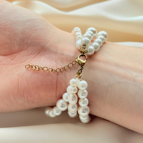 Элегантный трёхрядный браслет, сочетающий искусство и природу: два ряда выполнены из жемчуга Майорка — идеально круглого и сияющего, третий — из натурального жемчуга, придающего изделию живую текстуру и характер. Такое сочетание создаёт эффектный, но гармоничный образ, подчёркивающий тонкость и вкус обладательницы.