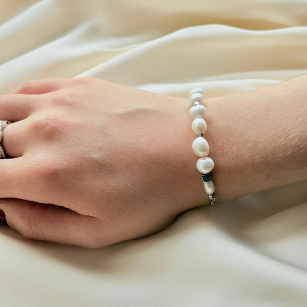 Изящный браслет, выполненный из ювелирного сплава с благородным серебристым покрытием. Основной акцент — утончённые вставки из натурального жемчуга и ювелирного гематита, придающие украшению сдержанный блеск и изысканную выразительность.