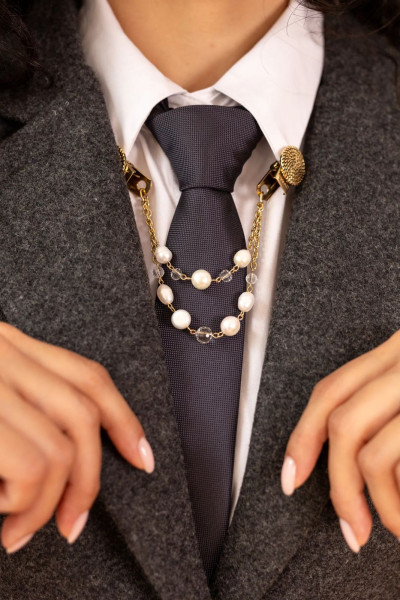 Брошка крепится с двух сторон — на воротник, лацканы— и соединена декоративной цепочкой с жемчугом