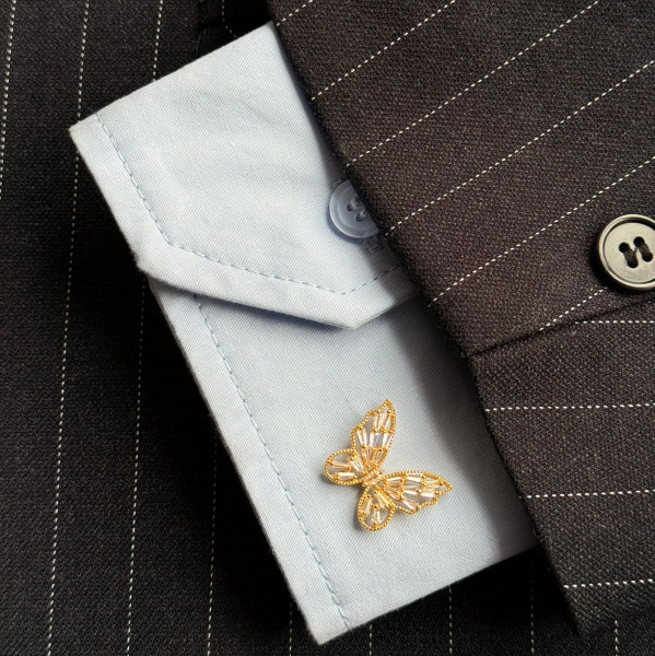 Элегантная брошь в виде изящной бабочки, выполненная в золотистом металле и украшенная прозрачными фасетированными вставками. Лёгкая, утончённая и сияющая, идеально подходит для украшения воротника, галстука или как запонки.