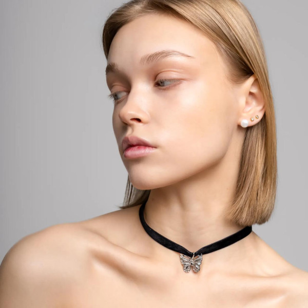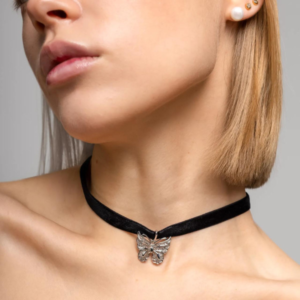 Изящный чокер из мягкой чёрной бархатной ленты дополнен серебристой подвеской в виде ажурной бабочки. Лёгкий и элегантный дизайн придаёт образу романтичность и утончённость, а бархатная текстура подчёркивает линию шеи. Длина чокера — 70 см, что позволяет удобно завязывать его на шее, регулируя посадку и создавая разные стилистические акценты. Подойдёт как для повседневных, так и для вечерних образов.