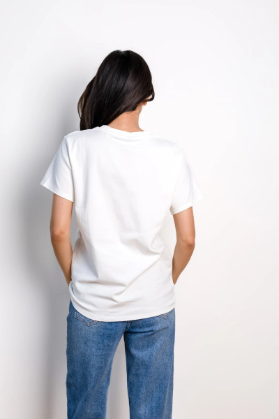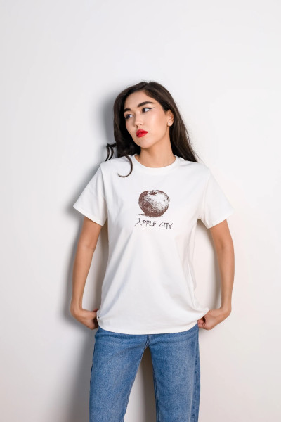 Простая на первый взгляд, но наполненная смыслом — белая футболка с чёрным яблоком — это отсылка к сердцу города Алматы, чьё название восходит к слову "алма", что означает "яблоко".