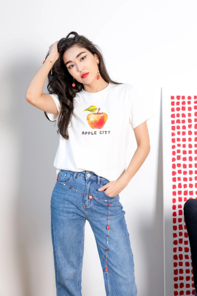 Простая на первый взгляд, но наполненная смыслом — белая футболка с красным яблоком — это отсылка к сердцу города Алматы, чьё название восходит к слову "алма", что означает "яблоко".