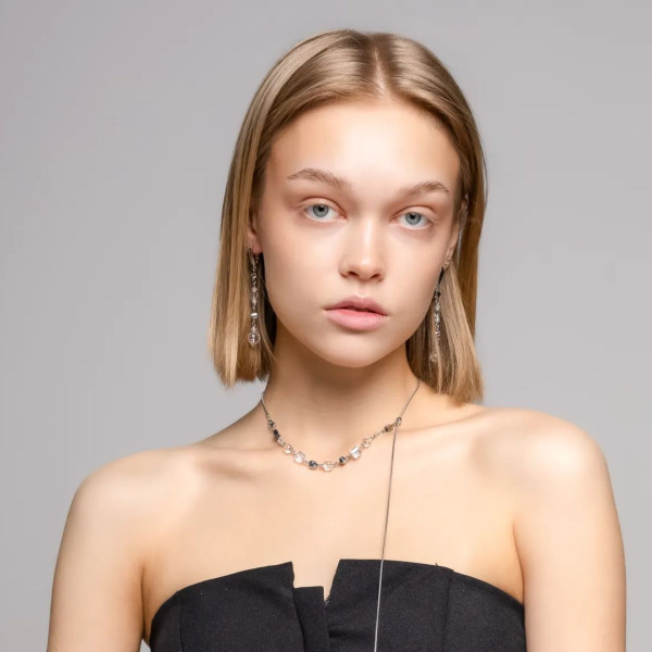 Это колье выполнено в актуальном дизайне «галстук», который визуально удлиняет силуэт и подчеркивает линию декольте. Главная особенность модели-свободная регулировка: вы можете менять длину подвесной части, адаптируя украшение под любой вырез.