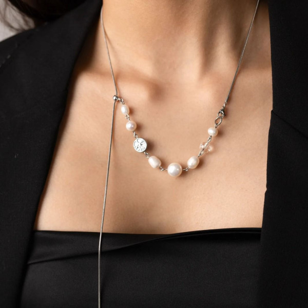 Асимметричная композиция из натурального жемчуга, горного хрусталя и гематита создаёт утончённый контраст фактур и оттенков. Мягкое сияние жемчуга подчёркивает женственность, хрусталь добавляет лёгкость, а гематит-благородный акцент.