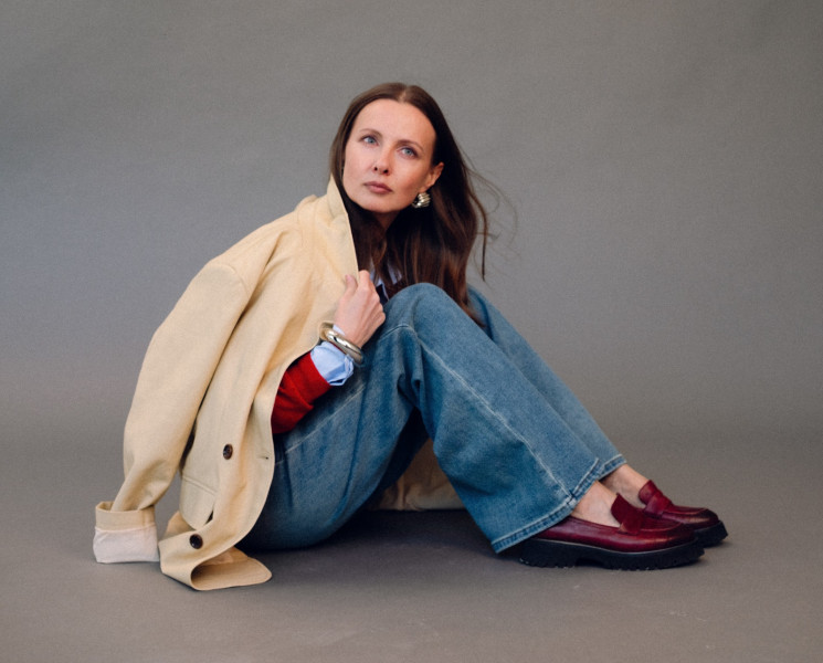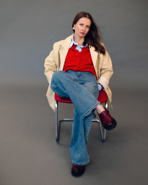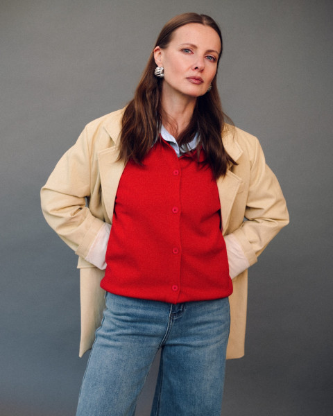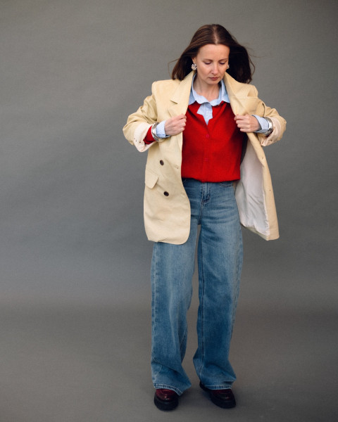 Нежный, приглушенный оттенок сливочного или лимонного крема (Pastel Yellow/Cream), который эффектно освежает образ и легко комбинируется как с нейтральными, так и с яркими цветами. Свободный, слегка оверсайз крой с прямыми плечами, который придает современный, расслабленный вид.
