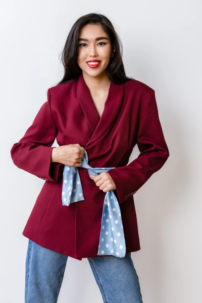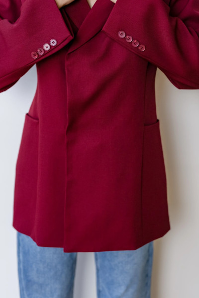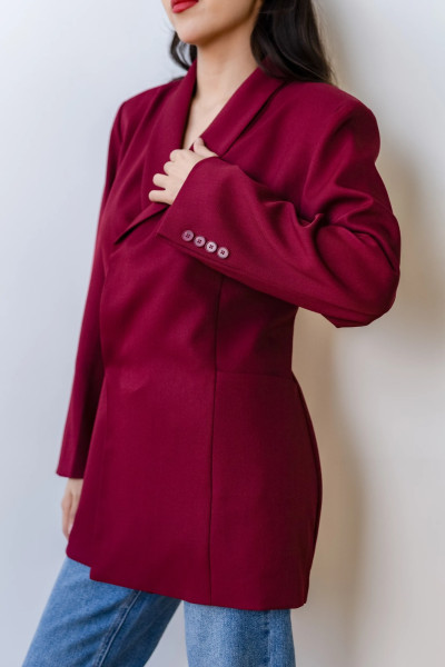 Приталенный бордовый жакет — изысканная классика в современном исполнении. Благодаря продуманному силуэту он красиво подчёркивает талию и делает образ элегантным и женственным. Такой жакет станет акцентной деталью гардероба и подчеркнёт ваш стиль как в офисе, так и в повседневной жизни. Выполнен из костюмной ткани высокого качества, которая держит форму и комфортна в носке