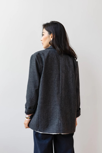 Элегантность и комфорт в одном изделии. Этот удлиненный пиджак свободного кроя станет идеальной базой для вашего демисезонного гардероба, легко сочетаясь как с деловыми, так и с повседневными образами.