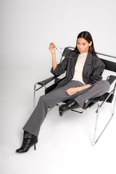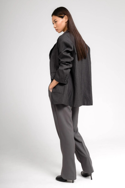 Модель выполнена из качественной смесовой ткани на основе шерсти и хлопка — материал держит форму, приятен к телу и обеспечивает комфорт в течение дня. Тонкая вертикальная полоска визуально вытягивает силуэт и добавляет образу элегантности.