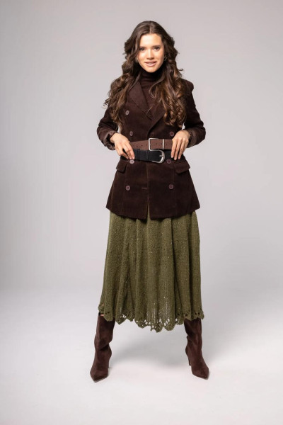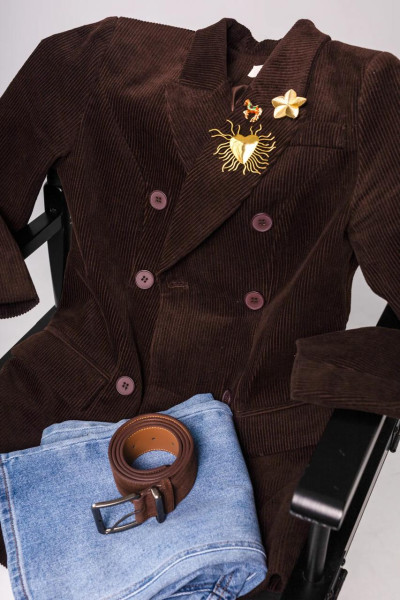 Этот пиджак из мягкого, бархатистого вельвета насыщенного шоколадного оттенка сочетает в себе элегантность и характер. Благодаря продуманному приталенному крою он подчёркивает линию талии и создаёт благородный, собранный силуэт.