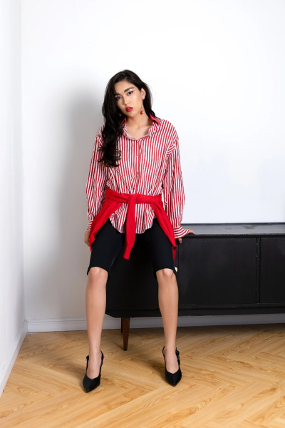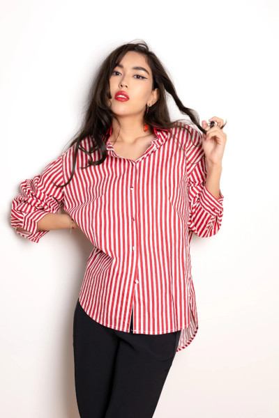 Стильная рубашка свободного кроя в акцентную полоску. Изготовлена из мягкого хлопка, она комфортна в носке и держит форму. Контрастный воротник и аккуратные пуговицы добавляют образу элегантности.