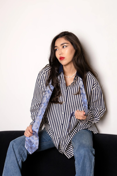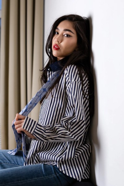 Стильная рубашка свободного кроя в классическую тёмно-синюю полоску — универсальная база гардероба. Изготовлена из мягкого хлопка, она комфортна в носке и держит форму. Контрастный воротник и аккуратные пуговицы добавляют образу элегантности.