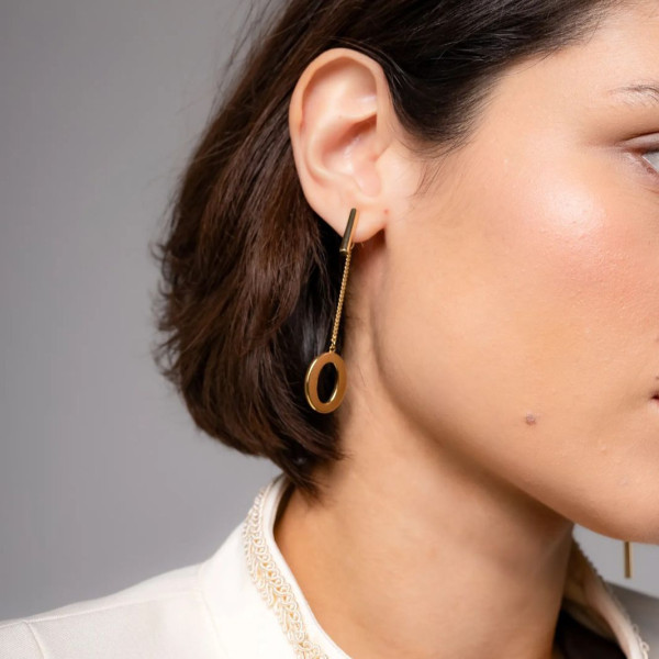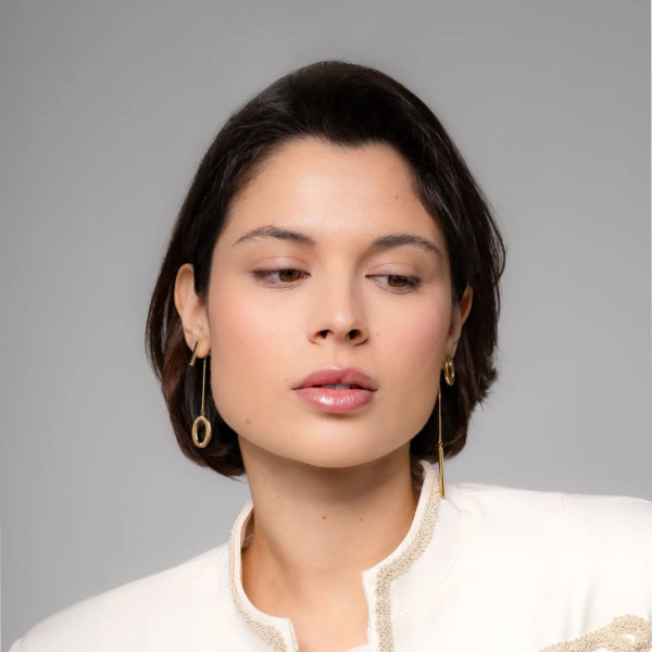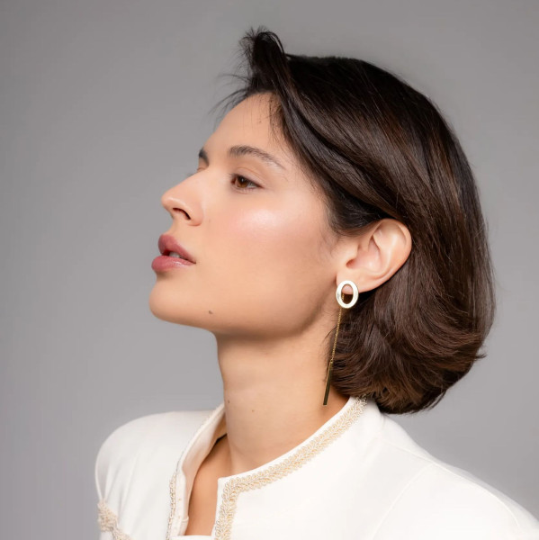 Одна серьга выполнена с удлинённой тонкой подвеской, вторая — с лаконичным овальным элементом. Контраст длины и формы создаёт динамичный, стильный образ и подчёркивает линию шеи.
