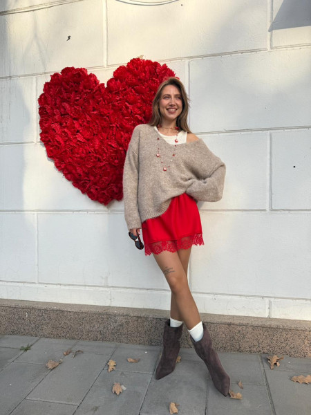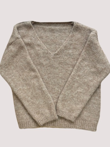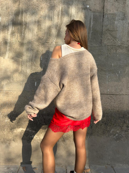 Мягкий и уютный свитер, выполненный из нежной смеси ангоры и шерсти. Модель идет двойкой — в комплект входит белая майка, создающая стильный многослойный эффект. Верхний свитер выполнен в нейтральном бежевом оттенке с объемной вязкой, что придает образу тепло и комфорт. Идеально подходит для прохладных дней и легко сочетается с джинсами, юбками или брюками.