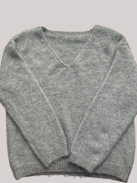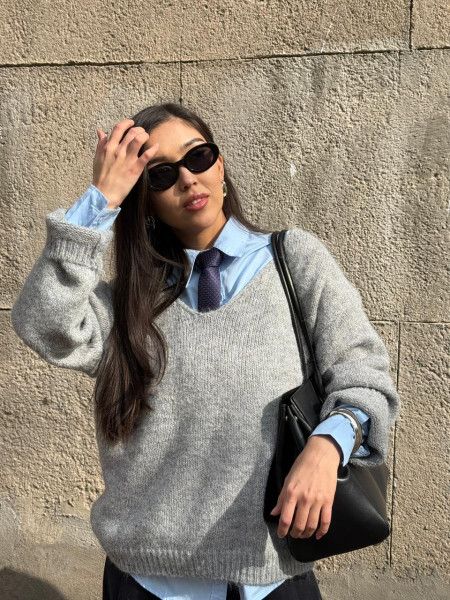 Мягкий и уютный свитер, выполненный из нежной смеси ангоры и шерсти. Модель идет двойкой — в комплект входит белая майка, создающая стильный многослойный эффект. Верхний свитер выполнен в нейтральном сером оттенке с объемной вязкой, что придает образу тепло и комфорт. Идеально подходит для прохладных дней и легко сочетается с джинсами, юбками или брюками.