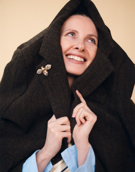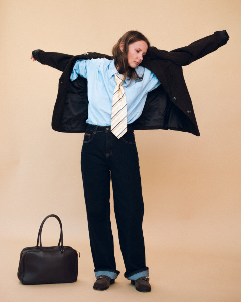 • Ткань: Высококачественный твид с выразительным плетением "елочка" (chevron/herringbone), который придает текстуру и глубину цвету. Материал плотный, хорошо держит форму и идеально подходит для прохладного времени года.