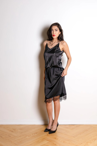 Стильная и универсальная юбка-комбинация с кружевной отделкой по низу — идеальный вариант как для повседневных образов, так и для вечерних выходов. Данная длина позволяет собрать образ под ваш стиль и настроение.