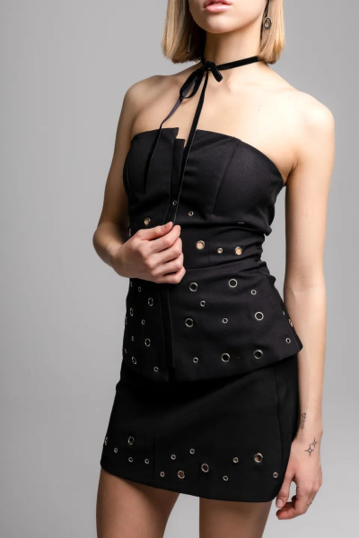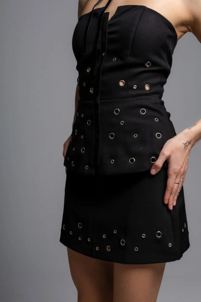 Стильная мини-юбка из костюмной ткани, которая отлично держит форму и обеспечивает комфортную посадку. Эффектная мини-юбка из плотной ткани с гладкой фактурой. Модель украшена металлическими люверсами разного диаметра, которые создают стильный акцент и придают образу современный характер.
